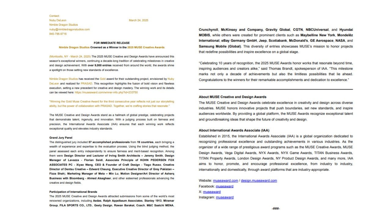 “Winning the Gold Muse Creative Award for the third consecutive year reflects not just our storytelling ability, but the power of collaboration with PRASAD. Together, we’re crafting stories that resonate,” said Nuby DeLeon, Founder of Nimble Dragon Studios.